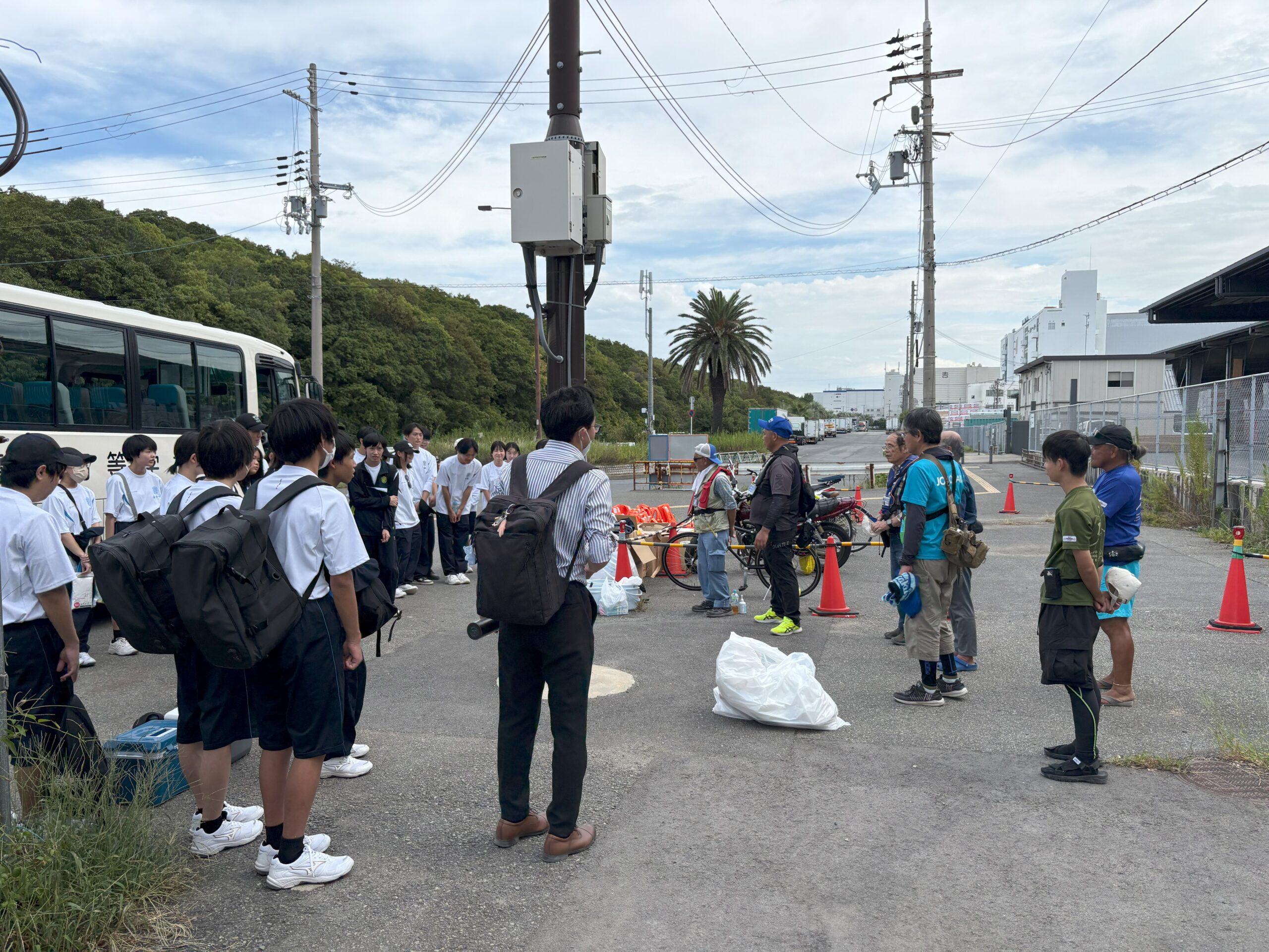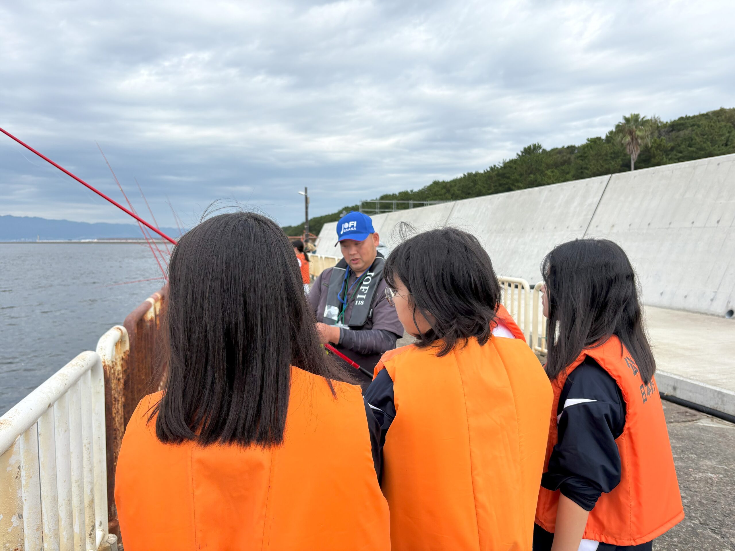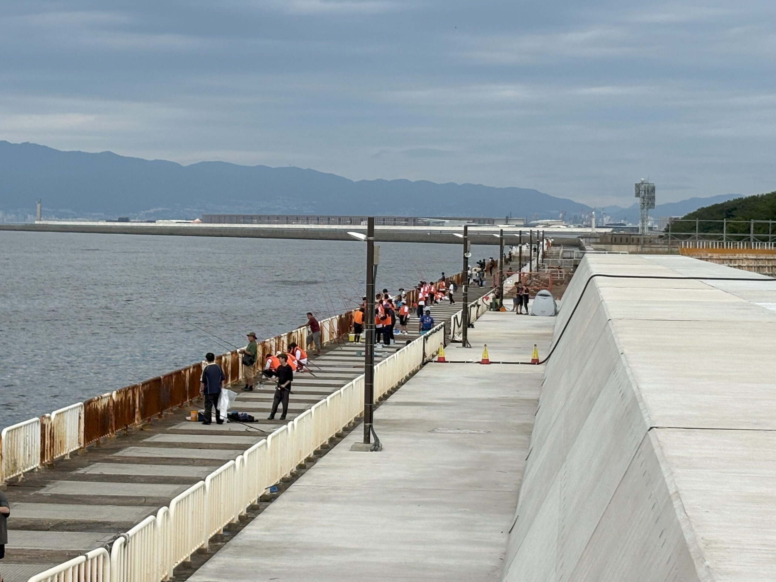 当日はくもりでこの夏から長引いてきた酷暑もなく、遠くに大阪・関西万博の大屋根リングも望めることができる、最高の釣り日和。生徒は高校1~2年生の30名程です。9時半過ぎに高校のマイクロバスで到着し、危険な魚や注意事項説明。ライフジャケット着用後それぞれ釣り道具をもって班ごとに釣り場へ向かいます。