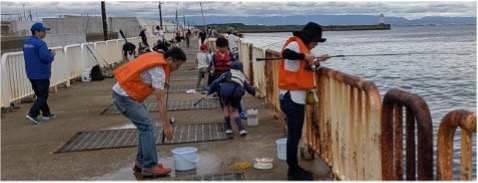 早朝からの釣り人は10:00前頃には多くが帰られるとの売店情報があり、当日のスケジュール通り参加者が9:00に来園されましたので、釣り安全教室を長めに実施した後、釣り場をなんとか確保。10:00前から実釣を始めましたが、ルアーフィッシングの後でありアジやサバはなかなか姿を見せてくれません。しかしながら徐々にサバが釣れ出し、昼前には全員「魚を釣り上げる体験ができました!」と隊長から報告がありました。