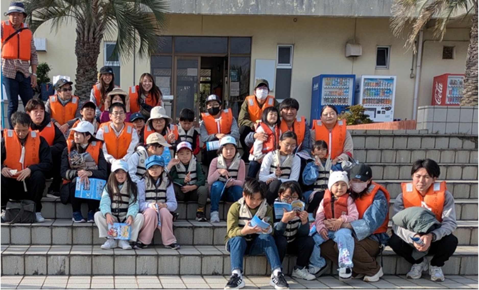主催者アイサツ、次にJOFI大阪のメンバーが危険な魚について勉強、魚類はヒレにするどい硬いトゲを持っているので気をつけよう。また、フグ類は毒をもっているので食べないようにと。また、カラスがポリ袋に入っている食べ物をねらっているので気をつけよう! と指導。開会式後で集合写真をとった。