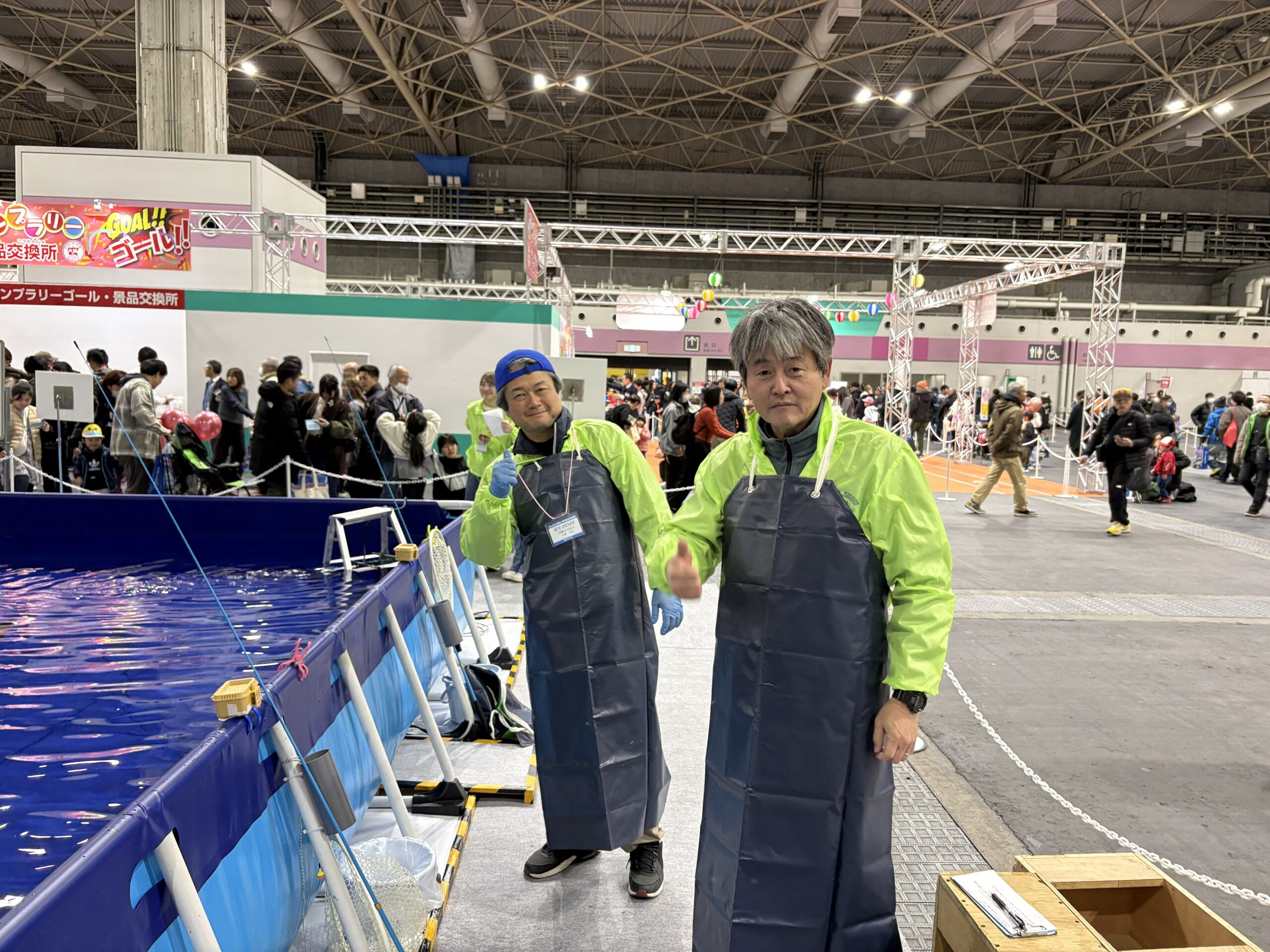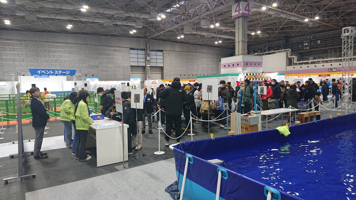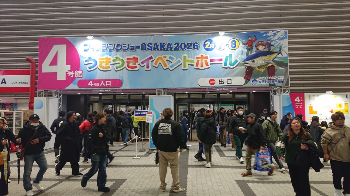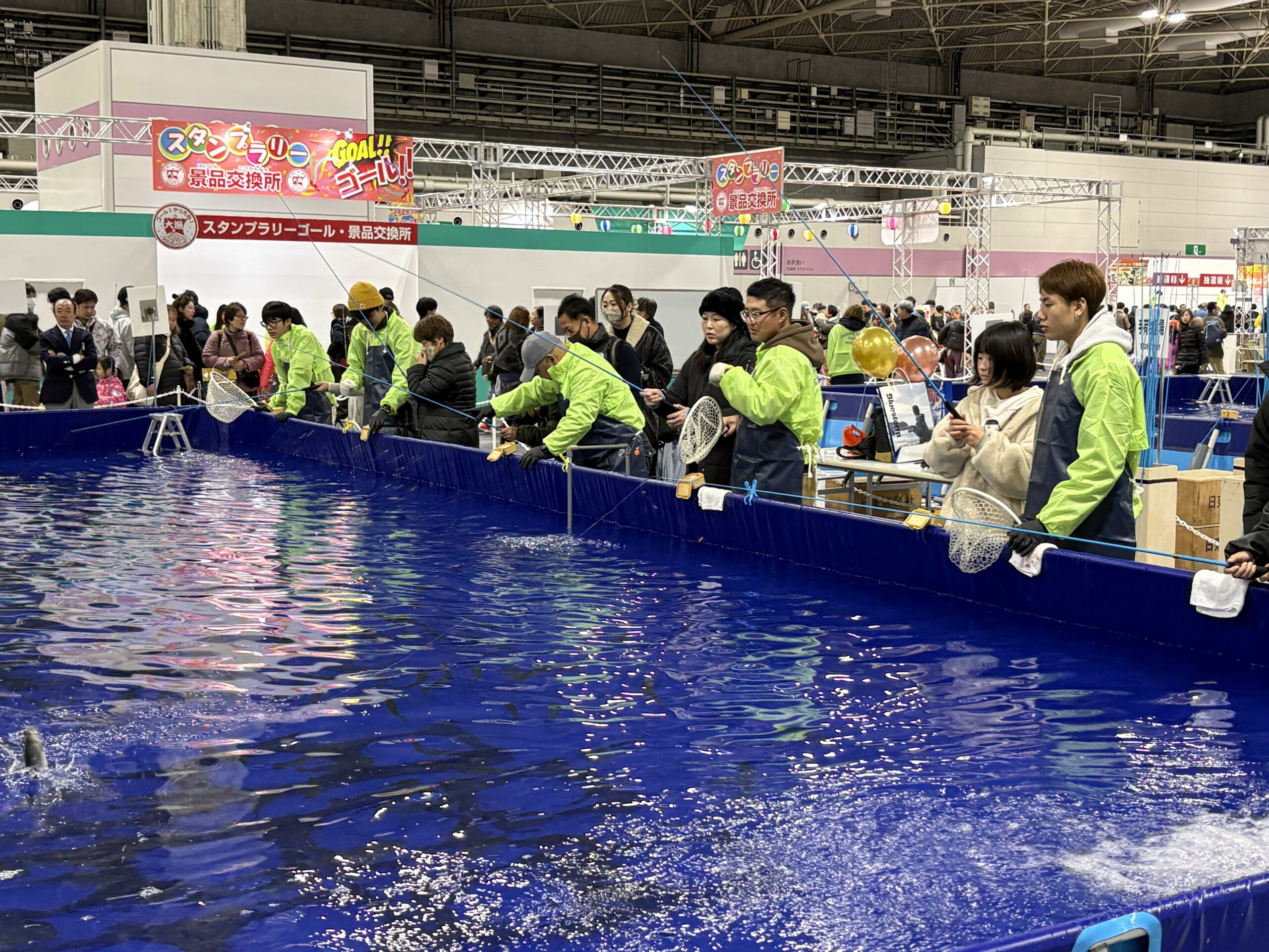 関西最大級の釣りイベントであるフィッシングショーOSAKA2026の4号館、イベントホールで実施された「体験マス釣り」のサポーターとして3名の釣りインストラクターが参加しました。中学生以下およびレディースとの参加資格があるニジマス釣りをお手伝いする役割です。当日はJOFI奈良の釣りインストラクターや学釣連およびヒューマンフィッシングカレッジの学生もサポーターとして参加。運営はマルキューが中心です。